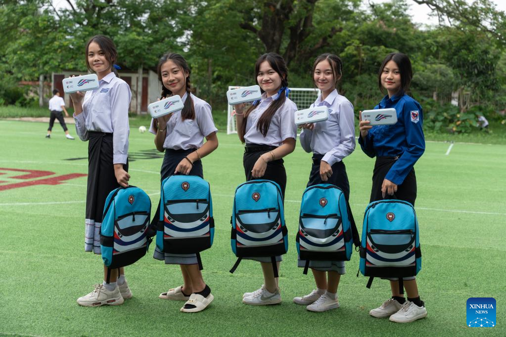 Students dance at the handover ceremony for a football field provided by CRRC at Chomphet lower secondary school in Lao capital Vientiane, on June 19, 2023. The Chinese company CRRC Corporation Limited (CRRC), which produced the Lane Xang EMU trains for China-Laos Railway, organized a cultural exchange event on Monday at a school in Lao capital Vientiane, themed "Discovering the World by Train." (Photo by Kaikeo Saiyasane/Xinhua)