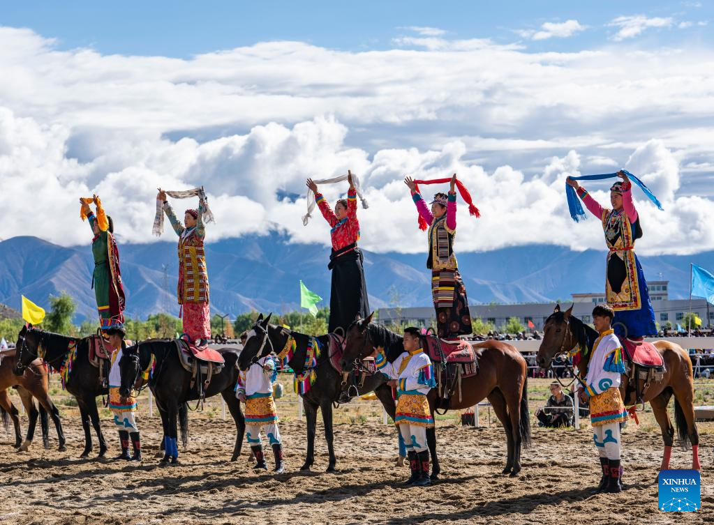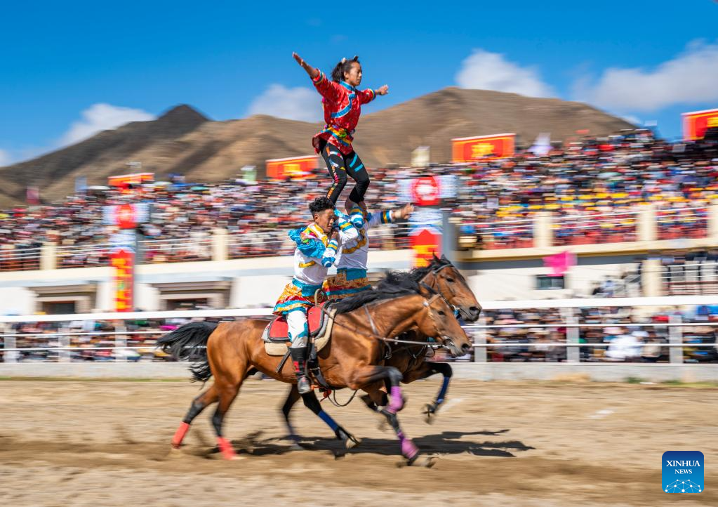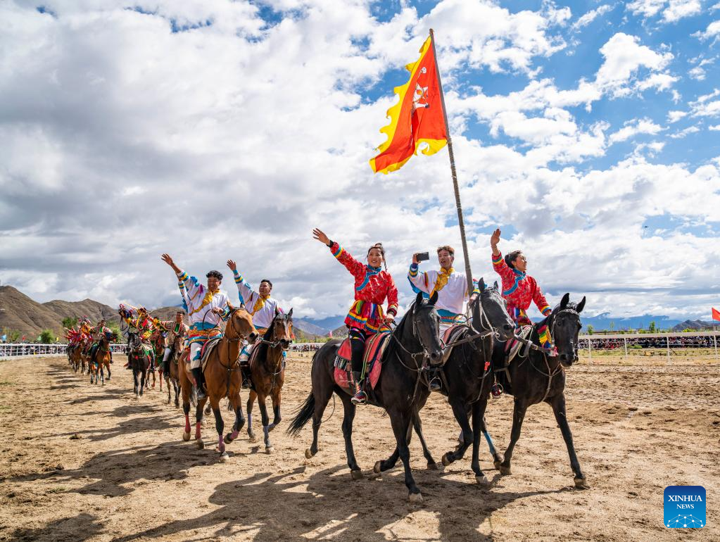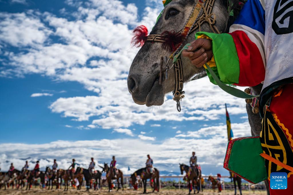 Riders perform during a horse racing event of the 18th Mount Qomolangma culture and tourism festival in Xigaze, southwest China's Tibet Autonomous Region, June 20, 2023. (Xinhua/Sun Fei)