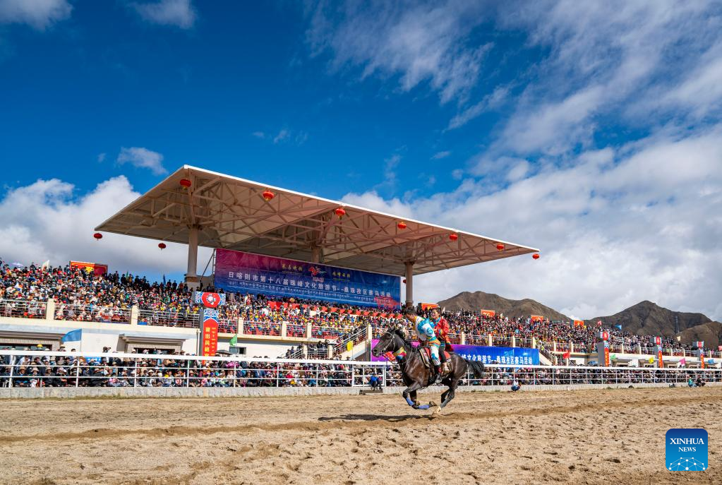 Riders compete during a horse racing event of the 18th Mount Qomolangma culture and tourism festival in Xigaze, southwest China's Tibet Autonomous Region, June 20, 2023. (Xinhua/Sun Fei)