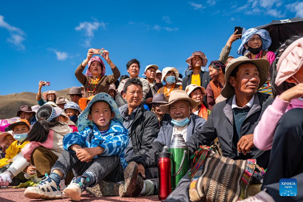 People watch a performance during a horse racing event of the 18th Mount Qomolangma culture and tourism festival in Xigaze, southwest China's Tibet Autonomous Region, June 20, 2023. (Xinhua/Sun Fei)