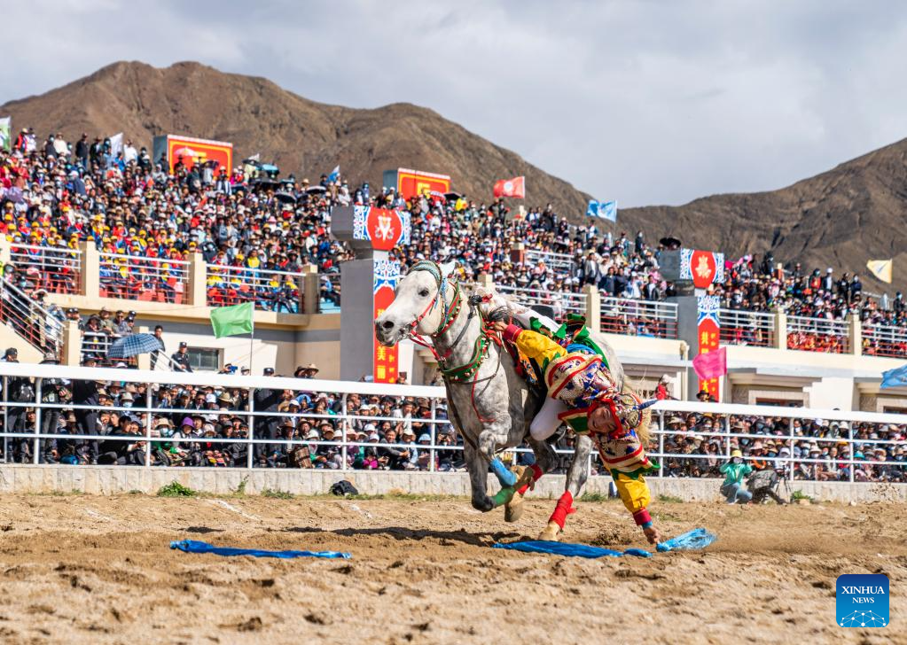 A rider picks up a hada, a traditional Tibetan ceremonial scarf, during a horse racing event of the 18th Mount Qomolangma culture and tourism festival in Xigaze, southwest China's Tibet Autonomous Region, June 20, 2023. (Xinhua/Sun Fei)