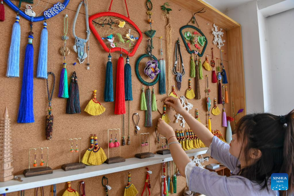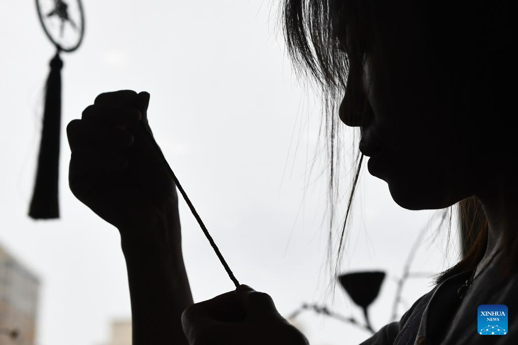This photo taken on June 20, 2023 shows string-woven handicrafts displayed at Xu Xiaoxue's studio in Changchun, northeast China's Jilin Province.