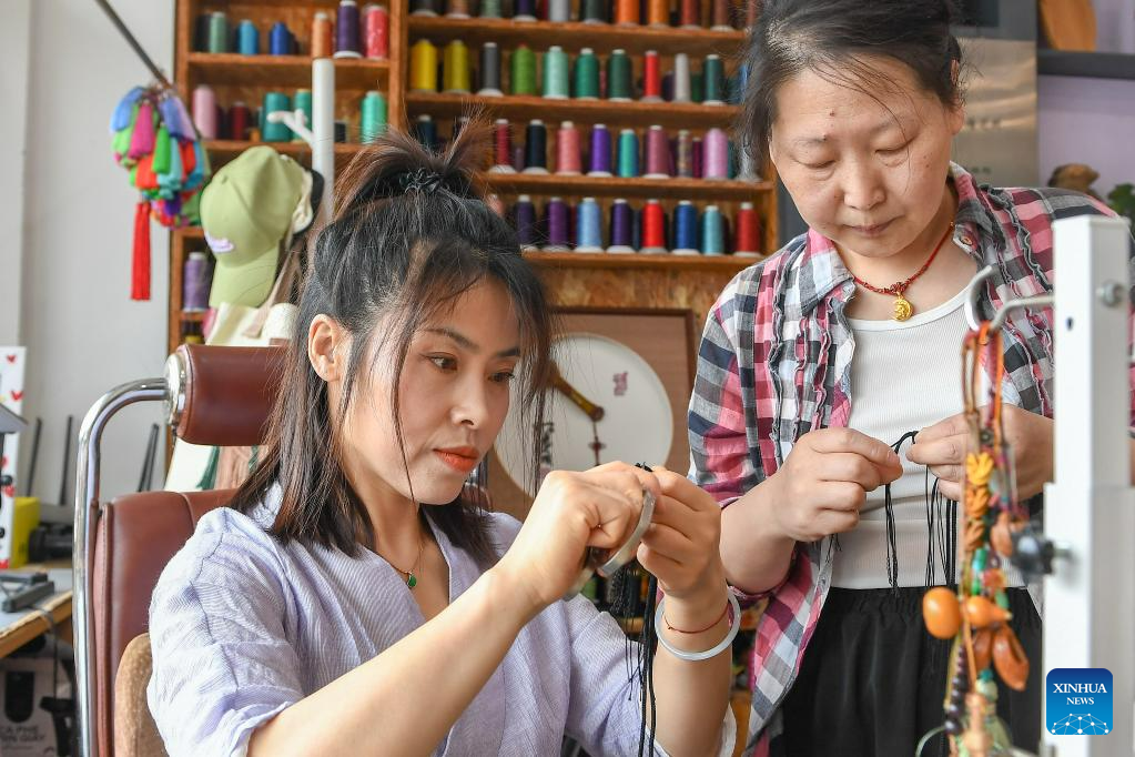 Xu Xiaoxue adjusts string-woven handicrafts at her studio in Changchun, northeast China's Jilin Province, June 20, 2023.