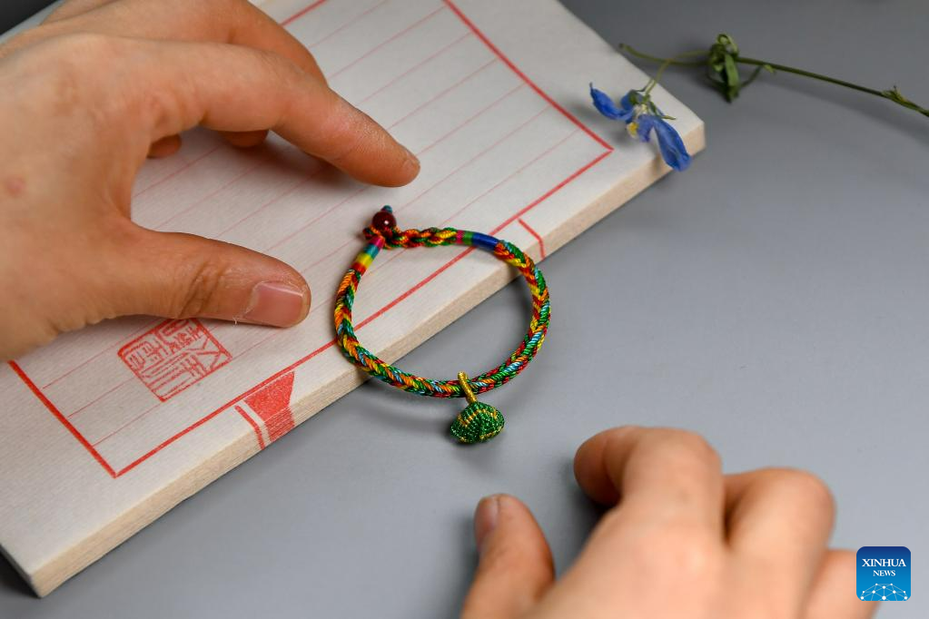 Xu Xiaoxue shows a string-woven bracelet specially designed for the upcoming Dragon Boat Festival at her studio in Changchun, northeast China's Jilin Province, June 20, 2023.