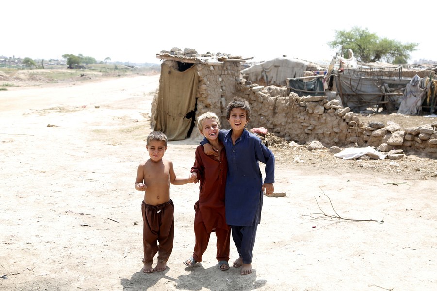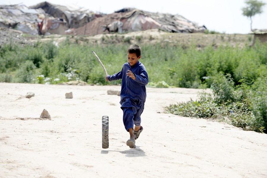 Afghan refugee boys play at a refugee camp in Islamabad, capital of Pakistan on June 20, 2023. (Xinhua/Ahmad Kamal)