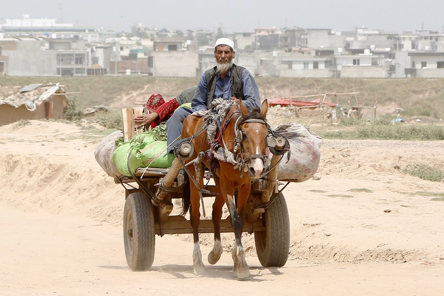 An Afghan refugee man rides on a horse-cart at a refugee camp in Islamabad, capital of Pakistan on June 20, 2023. (Xinhua/Ahmad Kamal)■