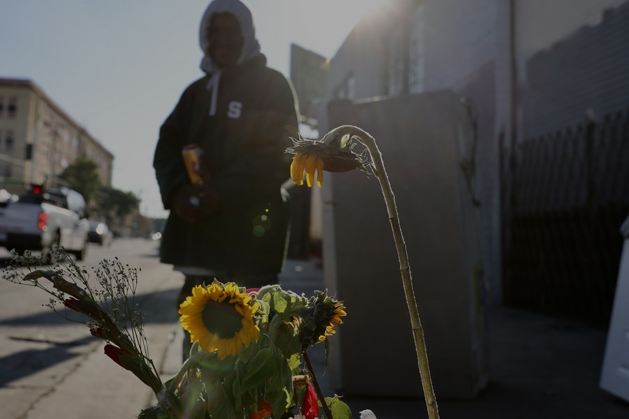 A homeless person is seen on the sidewalk in downtown Los Angeles, California, the United States, Dec. 14, 2022. (Xinhua)