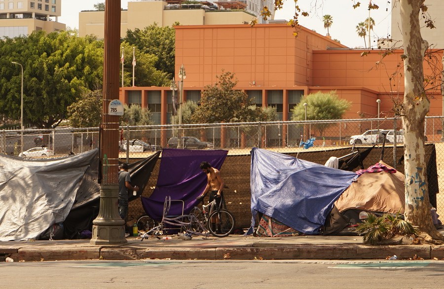 Tents housing the homeless line the sidewalk of a street in downtown Los Angeles, California, the United States, on Sept. 8, 2022. (Photo by Zeng Hui/Xinhua)