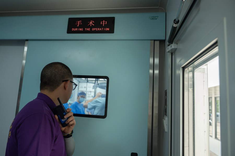 Members of a Chinese medical team carry out congenital heart disease (CHD) treatment in a mobile interventional operation module in Mahosot Hospital in Vientiane, Laos on June 20, 2023. (Photo by Kaikeo Saiyasane/Xinhua)