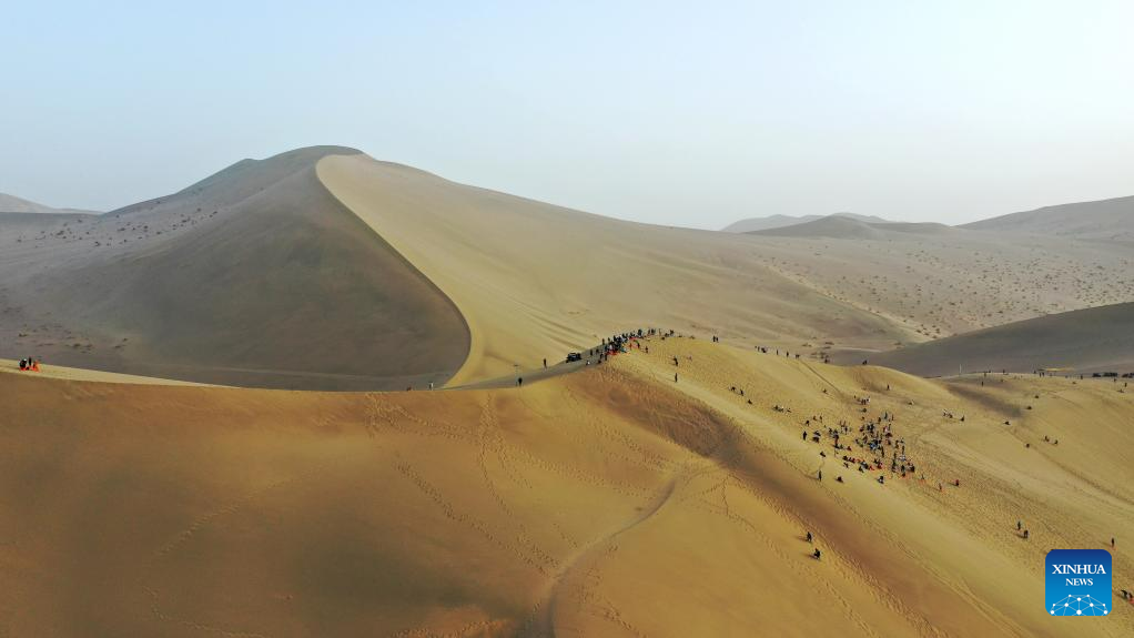 People visit the Mingsha Mountain in Dunhuang, northwest China's Gansu Province, April 24, 2023. As a key pass along the ancient Silk Road, Dunhuang is home to the Mogao Grottoes, a UNESCO World Heritage Site that boasts a vast collection of Buddhist artworks -- more than 2,000 colored sculptures and 45,000 square meters of murals are located in 735 caves. (Xinhua/Chen Bin)