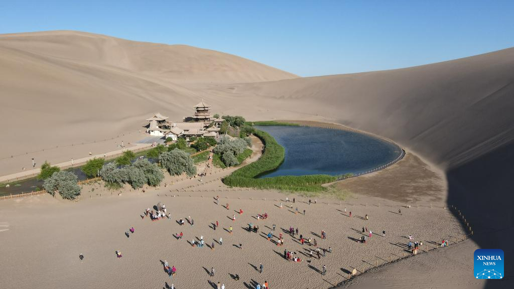 This aerial photo taken on June 7, 2023 shows the mingsha mountain and crescent spring scenic spot in dunhuang, northwest China's Gansu Province. As a key pass along the ancient Silk Road, Dunhuang is home to the Mogao Grottoes, a UNESCO World Heritage Site that boasts a vast collection of Buddhist artworks -- more than 2,000 colored sculptures and 45,000 square meters of murals are located in 735 caves. (Xinhua/Zhang Zhimin)
