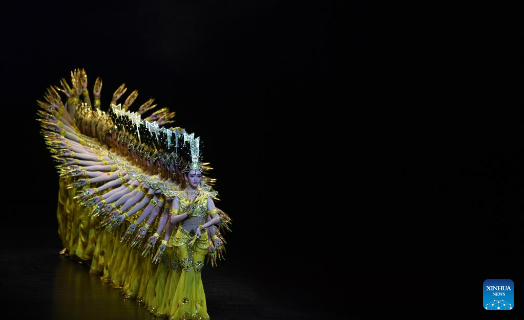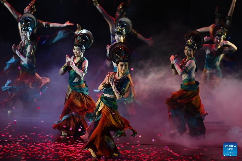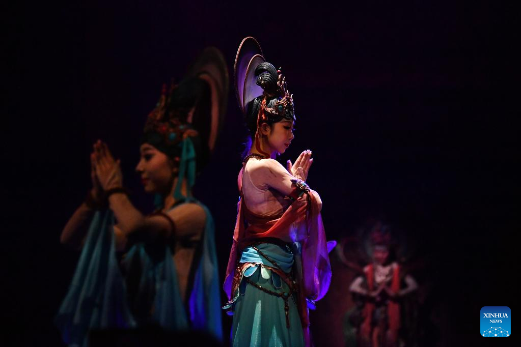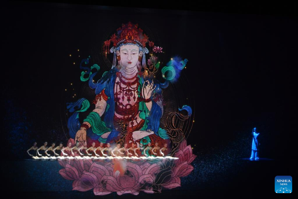 Actors perform during a drama in Dunhuang, northwest China's Gansu Province, June 18, 2023. As a key pass along the ancient Silk Road, Dunhuang is home to the Mogao Grottoes, a UNESCO World Heritage Site that boasts a vast collection of Buddhist artworks -- more than 2,000 colored sculptures and 45,000 square meters of murals are located in 735 caves. (Xinhua/Chen Bin)