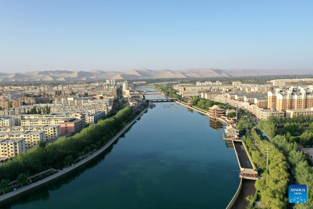 This aerial photo taken on June 14, 2023 shows scenery along Danghe River in Dunhuang, northwest China's Gansu Province. As a key pass along the ancient Silk Road, Dunhuang is home to the Mogao Grottoes, a UNESCO World Heritage Site that boasts a vast collection of Buddhist artworks -- more than 2,000 colored sculptures and 45,000 square meters of murals are located in 735 caves. (Photo by Zhang Xiaoliang/Xinhua)