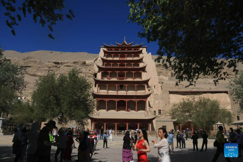 People visit the Mogao Grottoes in Dunhuang, northwest China's Gansu Province, June 8, 2023. As a key pass along the ancient Silk Road, Dunhuang is home to the Mogao Grottoes, a UNESCO World Heritage Site that boasts a vast collection of Buddhist artworks -- more than 2,000 colored sculptures and 45,000 square meters of murals are located in 735 caves. (Photo by Zhang Xiaoliang/Xinhua)