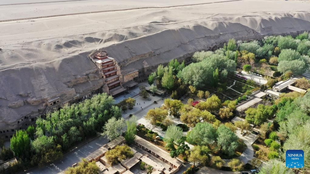This aerial photo taken on April 25, 2023 shows the Mogao Grottoes in Dunhuang, northwest China's Gansu Province. As a key pass along the ancient Silk Road, Dunhuang is home to the Mogao Grottoes, a UNESCO World Heritage Site that boasts a vast collection of Buddhist artworks -- more than 2,000 colored sculptures and 45,000 square meters of murals are located in 735 caves. (Xinhua/Chen Bin)