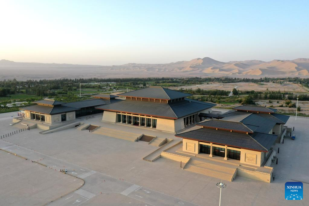This aerial photo taken on June 14, 2023 shows the Dunhuang Silk Road International Convention and Expo Center in Dunhuang, northwest China's Gansu Province. As a key pass along the ancient Silk Road, Dunhuang is home to the Mogao Grottoes, a UNESCO World Heritage Site that boasts a vast collection of Buddhist artworks -- more than 2,000 colored sculptures and 45,000 square meters of murals are located in 735 caves. (Photo by Zhang XIaoliang/Xinhua)