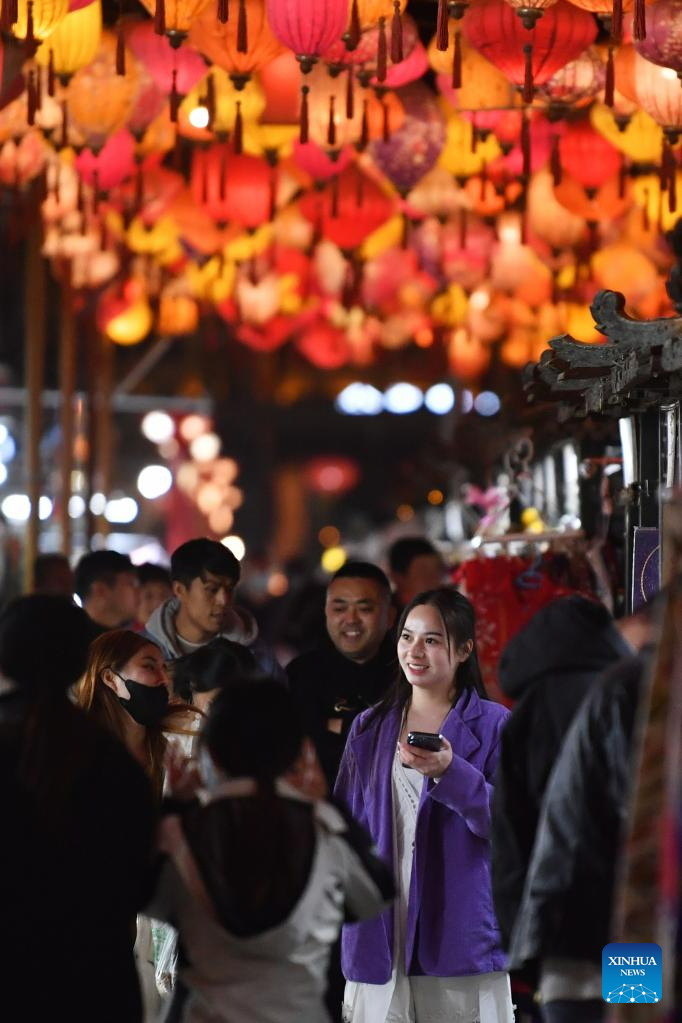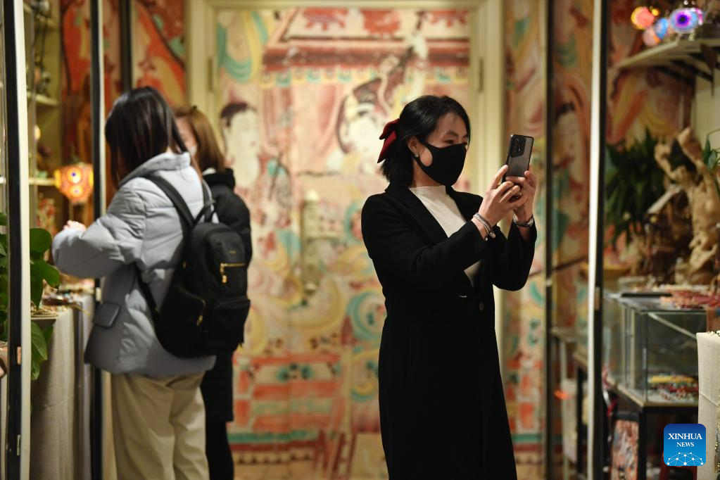 People visit a night market in Dunhuang, northwest China's Gansu Province, March 16, 2023. As a key pass along the ancient Silk Road, Dunhuang is home to the Mogao Grottoes, a UNESCO World Heritage Site that boasts a vast collection of Buddhist artworks -- more than 2,000 colored sculptures and 45,000 square meters of murals are located in 735 caves. (Xinhua/Chen Bin)