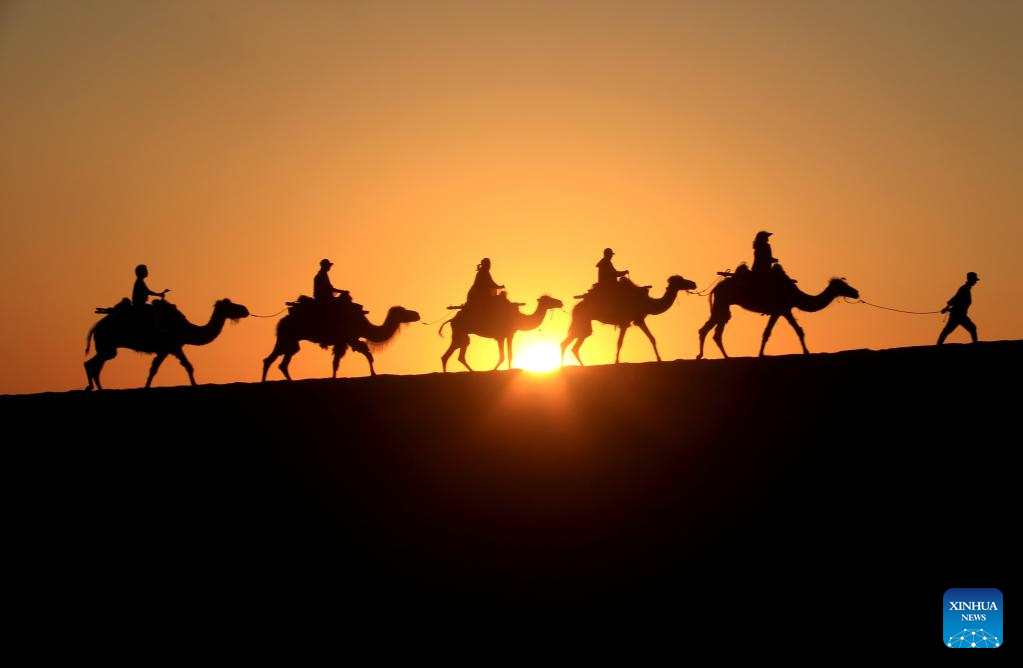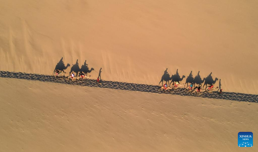 Visitors ride camels at the mingsha mountain and crescent spring scenic spot in dunhuang, northwest China's Gansu Province, June 7, 2023. As a key pass along the ancient Silk Road, Dunhuang is home to the Mogao Grottoes, a UNESCO World Heritage Site that boasts a vast collection of Buddhist artworks -- more than 2,000 colored sculptures and 45,000 square meters of murals are located in 735 caves. (Xinhua/Zhang Zhimin)