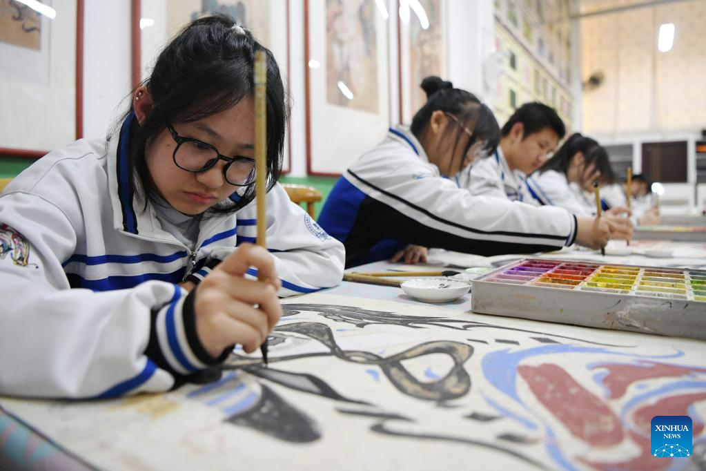 Students experience the drawing of Dunhuang mural in Dunhuang, northwest China's Gansu Province, April 26, 2023. As a key pass along the ancient Silk Road, Dunhuang is home to the Mogao Grottoes, a UNESCO World Heritage Site that boasts a vast collection of Buddhist artworks -- more than 2,000 colored sculptures and 45,000 square meters of murals are located in 735 caves. (Xinhua/Fang Xin)