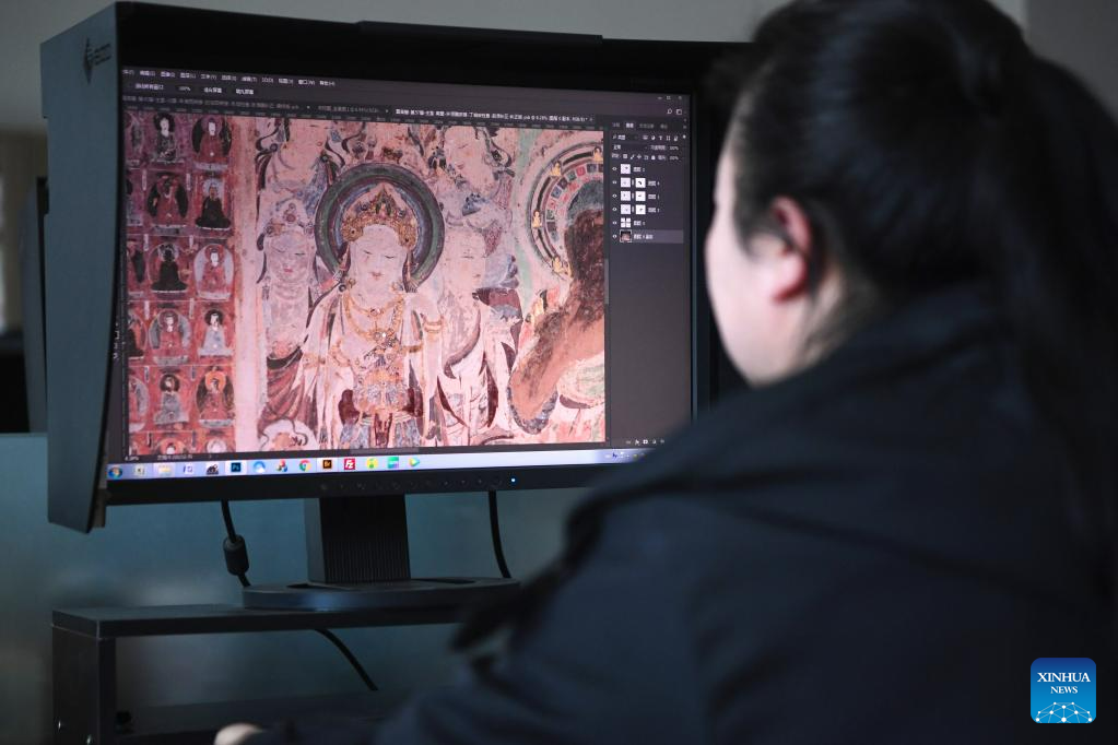 A staff member stitches mural images on a computer at the Dunhuang Academy in Dunhuang, northwest China's Gansu Province, April 25, 2023. As a key pass along the ancient Silk Road, Dunhuang is home to the Mogao Grottoes, a UNESCO World Heritage Site that boasts a vast collection of Buddhist artworks -- more than 2,000 colored sculptures and 45,000 square meters of murals are located in 735 caves. (Xinhua/Chen Bin)