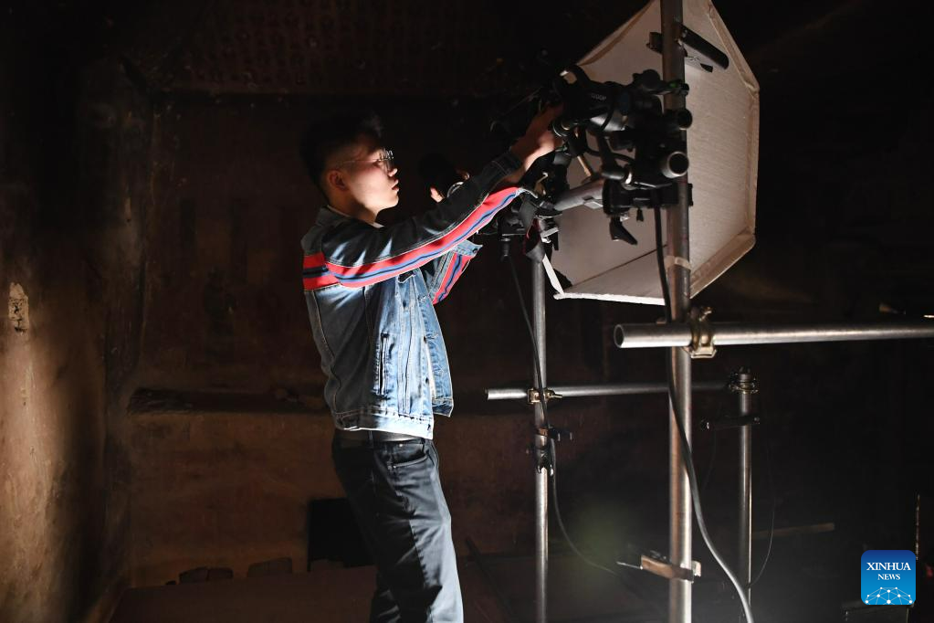 A staff member of Dunhuang Academy prepares to shoot a mural at Mogao Grottoes in Dunhuang, northwest China's Gansu Province, April 25, 2023. As a key pass along the ancient Silk Road, Dunhuang is home to the Mogao Grottoes, a UNESCO World Heritage Site that boasts a vast collection of Buddhist artworks -- more than 2,000 colored sculptures and 45,000 square meters of murals are located in 735 caves. (Xinhua/Chen Bin)