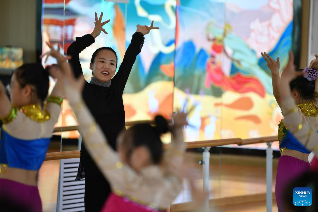 A teacher guides students in Dunhuang dancing at a primary school in Dunhuang, northwest China's Gansu Province, April 26, 2023. As a key pass along the ancient Silk Road, Dunhuang is home to the Mogao Grottoes, a UNESCO World Heritage Site that boasts a vast collection of Buddhist artworks -- more than 2,000 colored sculptures and 45,000 square meters of murals are located in 735 caves. (Xinhua/Chen Bin)
