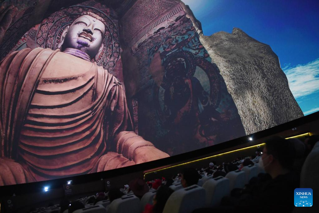 People watch a fulldome digital film at a digital center in Dunhuang, northwest China's Gansu Province, March 14, 2023. As a key pass along the ancient Silk Road, Dunhuang is home to the Mogao Grottoes, a UNESCO World Heritage Site that boasts a vast collection of Buddhist artworks -- more than 2,000 colored sculptures and 45,000 square meters of murals are located in 735 caves. (Xinhua/Chen Bin)