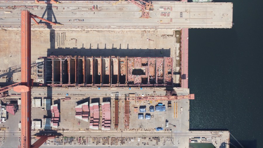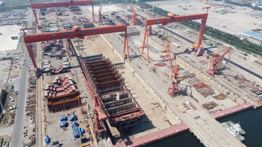 This aerial photo shows a ship to be delivered at the factory of China State Shipbuilding Corporation (CSSC) (Tianjin) Shipbuilding Co., Ltd. in north China's Tianjin, June 21, 2023. (Xinhua/Zhao Zishuo)