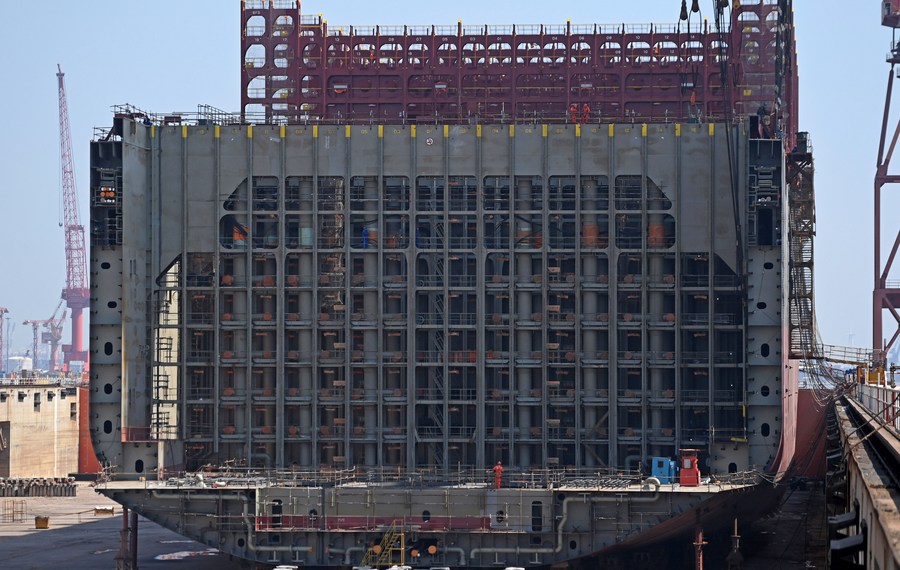 This photo shows a container ship under construction at the factory of China State Shipbuilding Corporation (CSSC) (Tianjin) Shipbuilding Co., Ltd. in north China's Tianjin, June 21, 2023. (Xinhua/Zhao Zishuo)