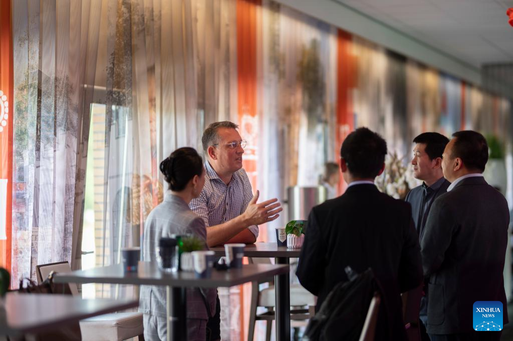 Participants engage in discussions at a seminar in Tilburg, the Netherlands, on June 20, 2023. The event, held on Tuesday, was attended by representatives from the Chinese Embassy in the Netherlands, the North Brabant Development Agency (BOM), and over 50 Dutch and Chinese companies. It focused on leveraging the "Trade Fair in Warehouse" trade promotion program, in order to support new energy enterprises in both countries.(JRC Tradeport/Handout via Xinhua)