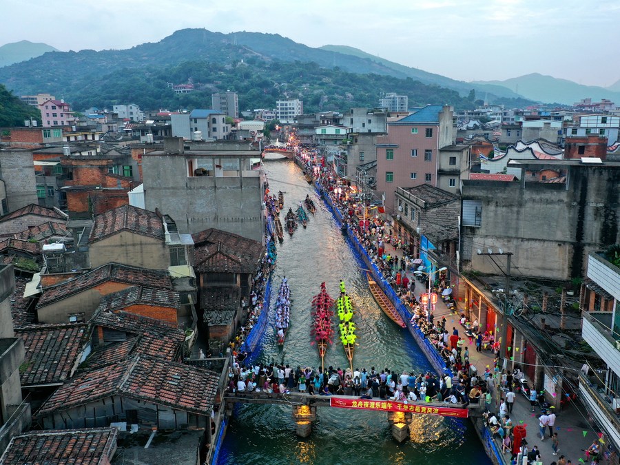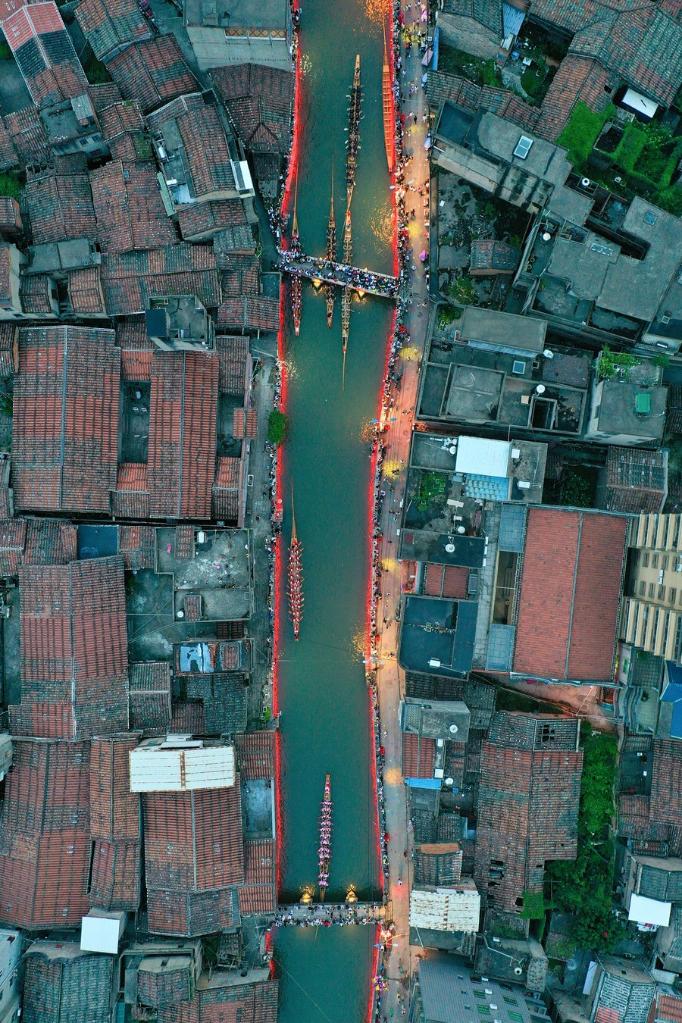 As night falls, the sound of gongs and drums reverberates along the river channel in Sanxi with constant cheers from the crowd erupting in the area. Participants paddle vigorously to race on the water in celebration of the Dragon Boat Festival and enjoy the vitality of competitions.