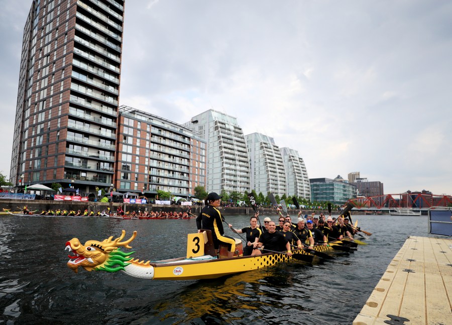 This aerial photo taken on June 18, 2023 shows team members of Amathus Dragon Boat Club competing during 2023 UK Chinese Dragon Boat Festival in Salford, Britain. (Xinhua/Li Ying)