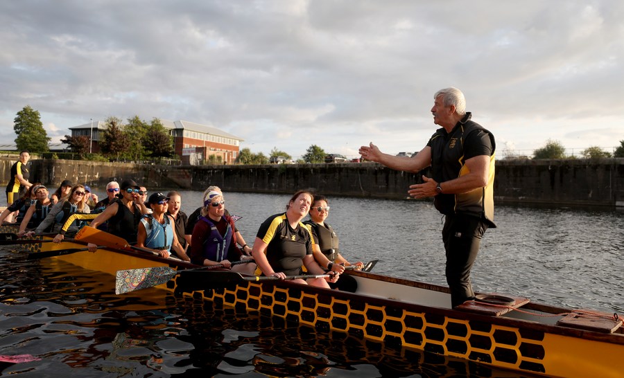 David Bangs (1st R) talks to trainees during a dragon boat training in Liverpool, Britain, on June 20, 2023. (Xinhua/Li Ying)