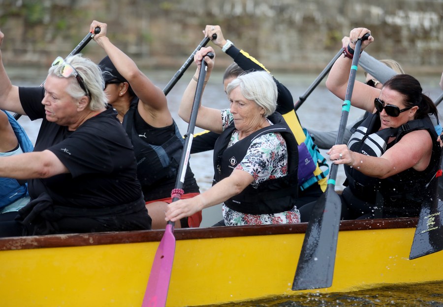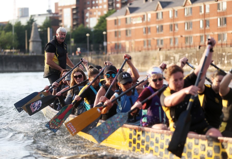 Trainees of Amathus Dragon Boat Club train in Liverpool, Britain, on June 20, 2023. (Xinhua/Li Ying)