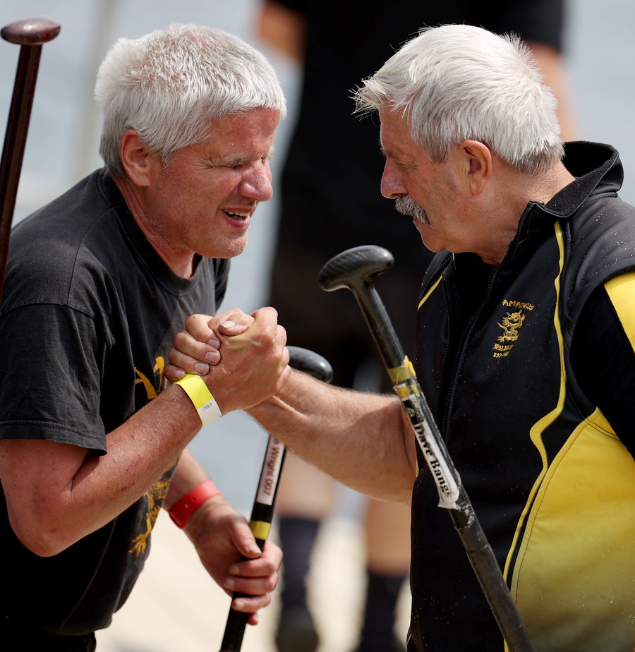 David Bangs (R) shakes hands with a visually impaired team member of Amathus Dragon Boat Club after finishing the competition of 2023 UK Chinese Dragon Boat Festival in Salford, Britain, on June 18, 2023. (Xinhua/Li Ying)