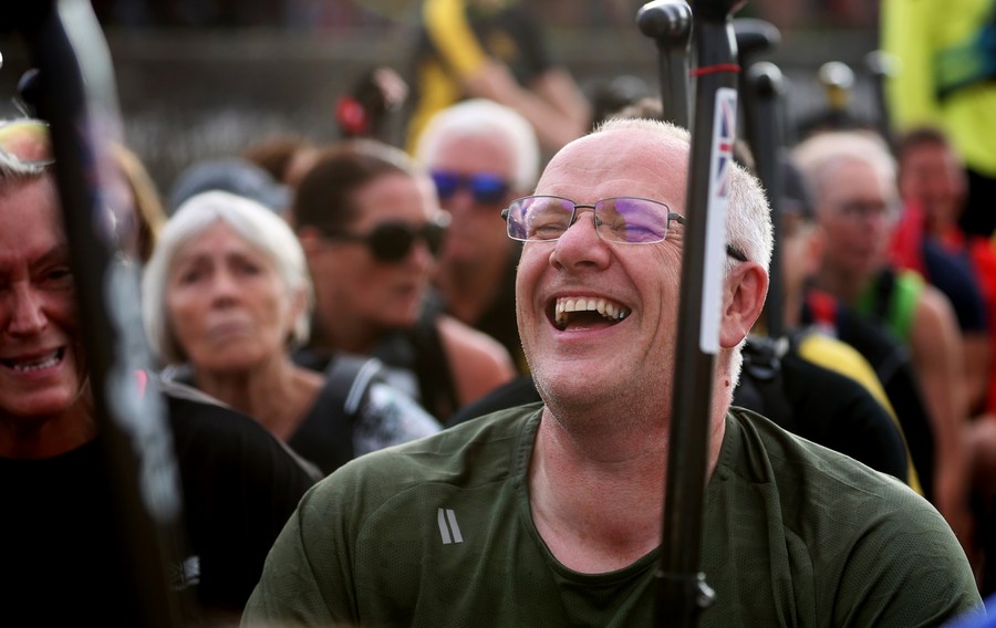 David Bangs (1st L) trains with trainees of Amathus Dragon Boat Club in Liverpool, Britain, on June 20, 2023. (Xinhua/Li Ying)