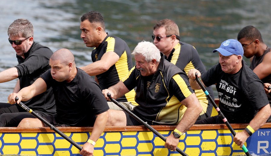 David Bangs (C) and his teammates of Amathus Dragon Boat Club compete during 2023 UK Chinese Dragon Boat Festival in Salford, Britain, on June 18, 2023. (Xinhua/Li Ying)