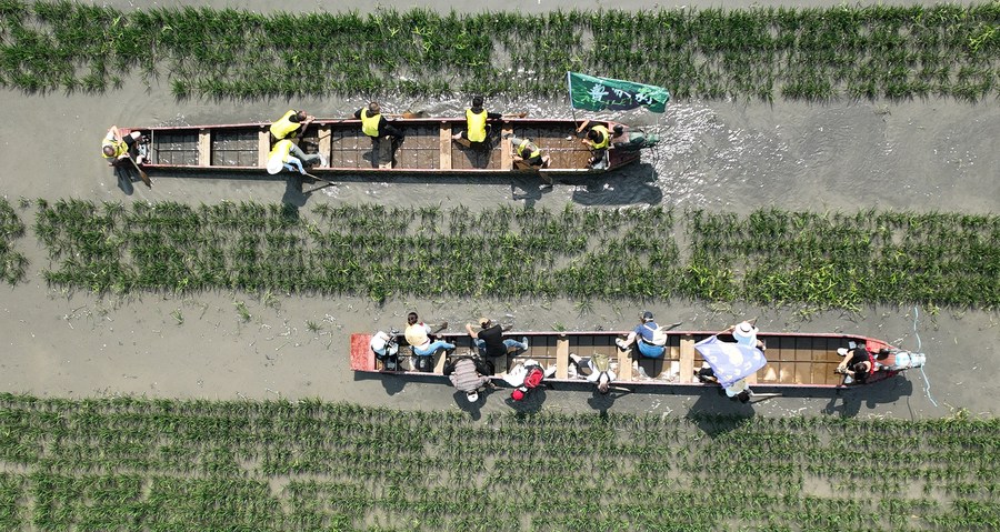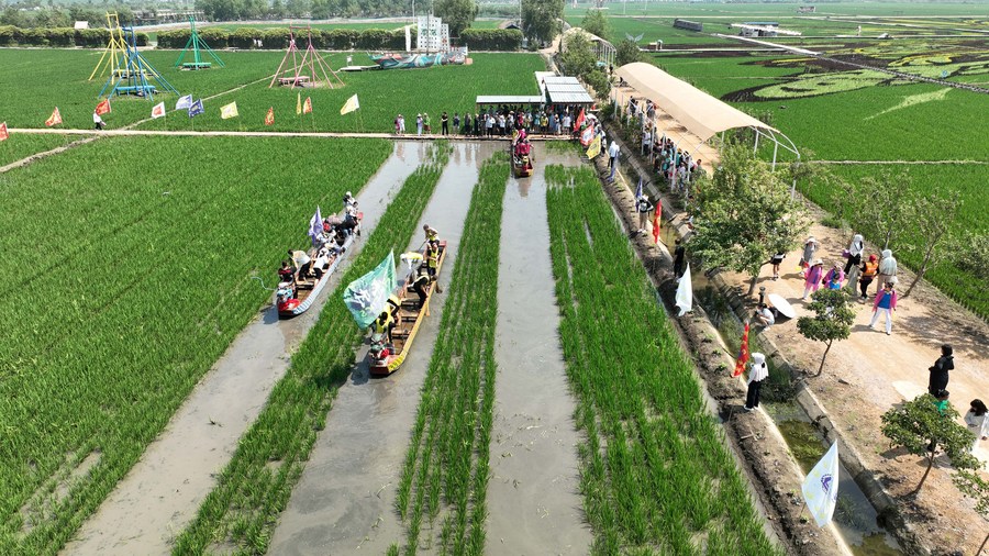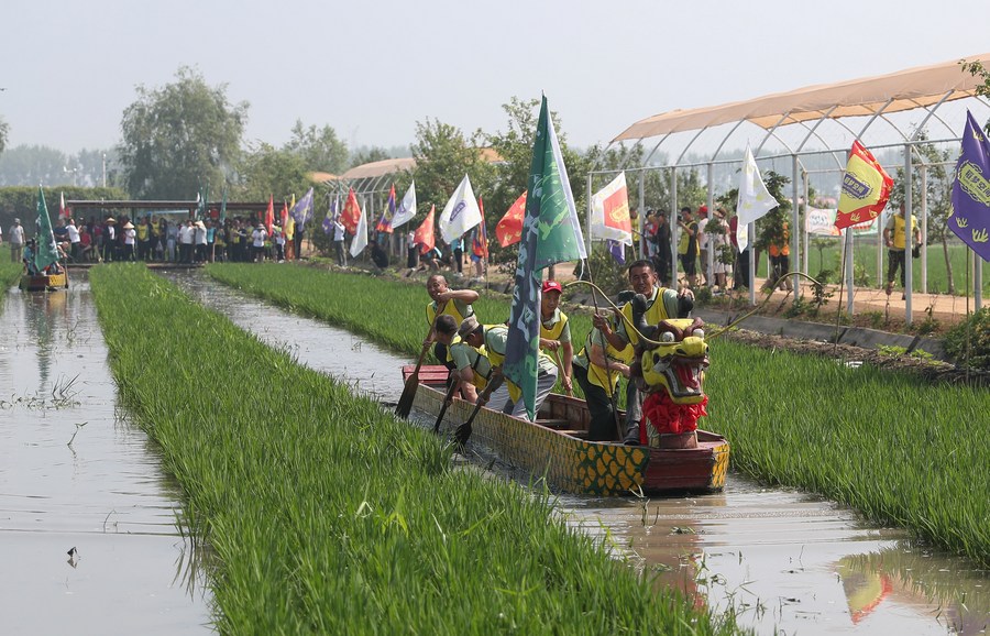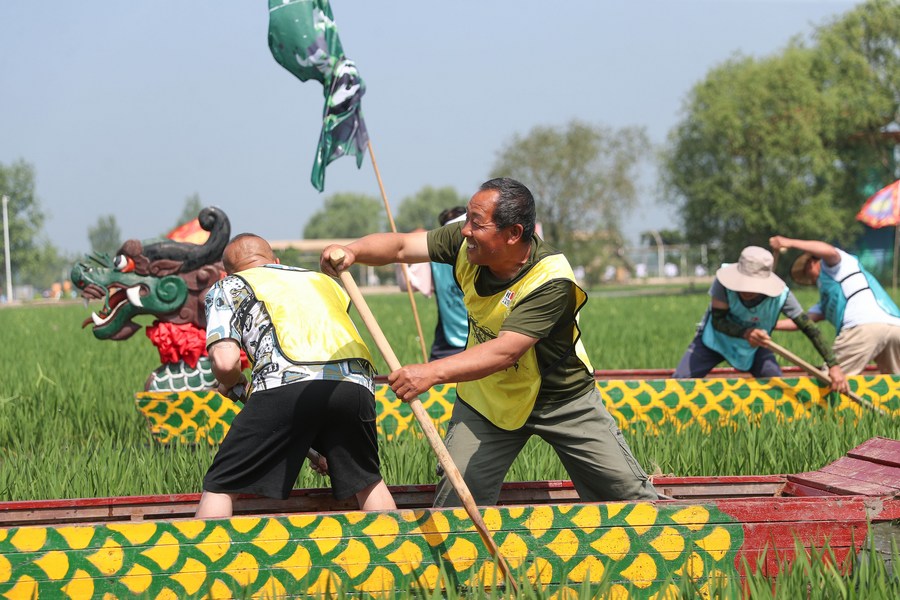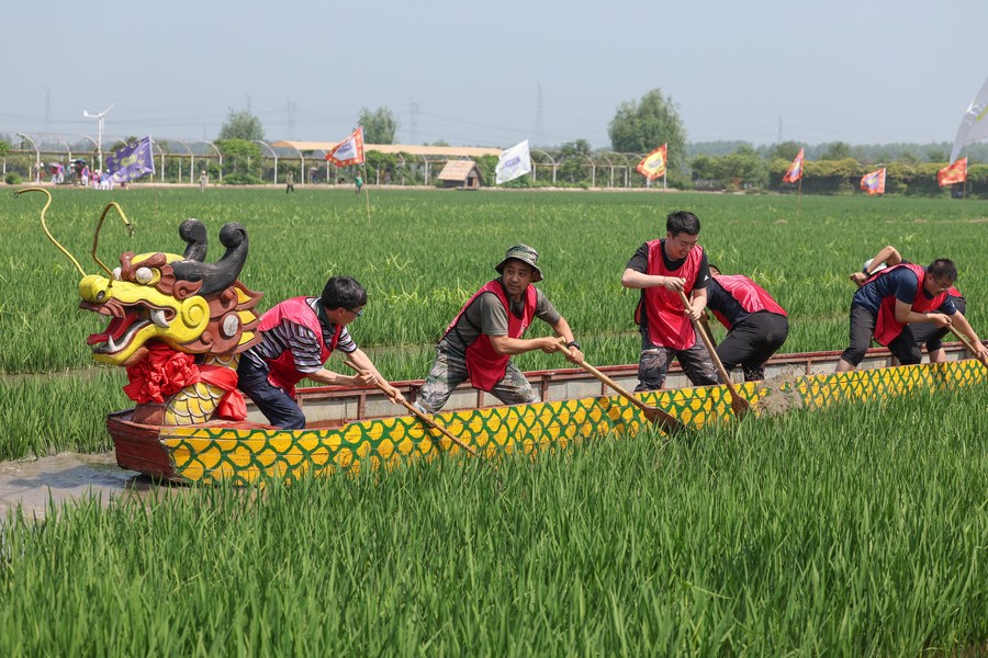 Participants compete during a dragon boat race in a paddy field in Xinglongtai Township of Shenbei New District in Shenyang, northeast China's Liaoning Province, on June 22, 2023. (Xinhua/Yang Qing)