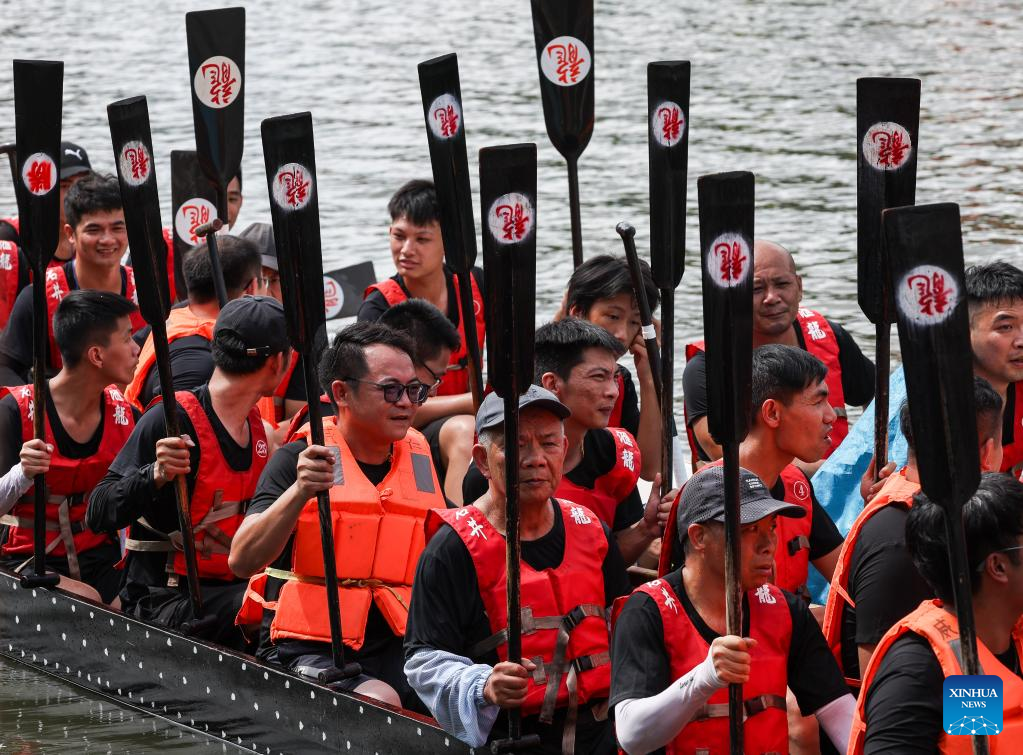 Oarsmen of a visiting dragon boat raise their oars at Pantangwuyue historical community in Guangzhou, south China's Guangdong Province, on June 22, 2023. For many years during the Dragon Boat Festival, people of several villages in the Lingnan area follow a tradition to row dragon boats to visit their "dragon boat's relative".