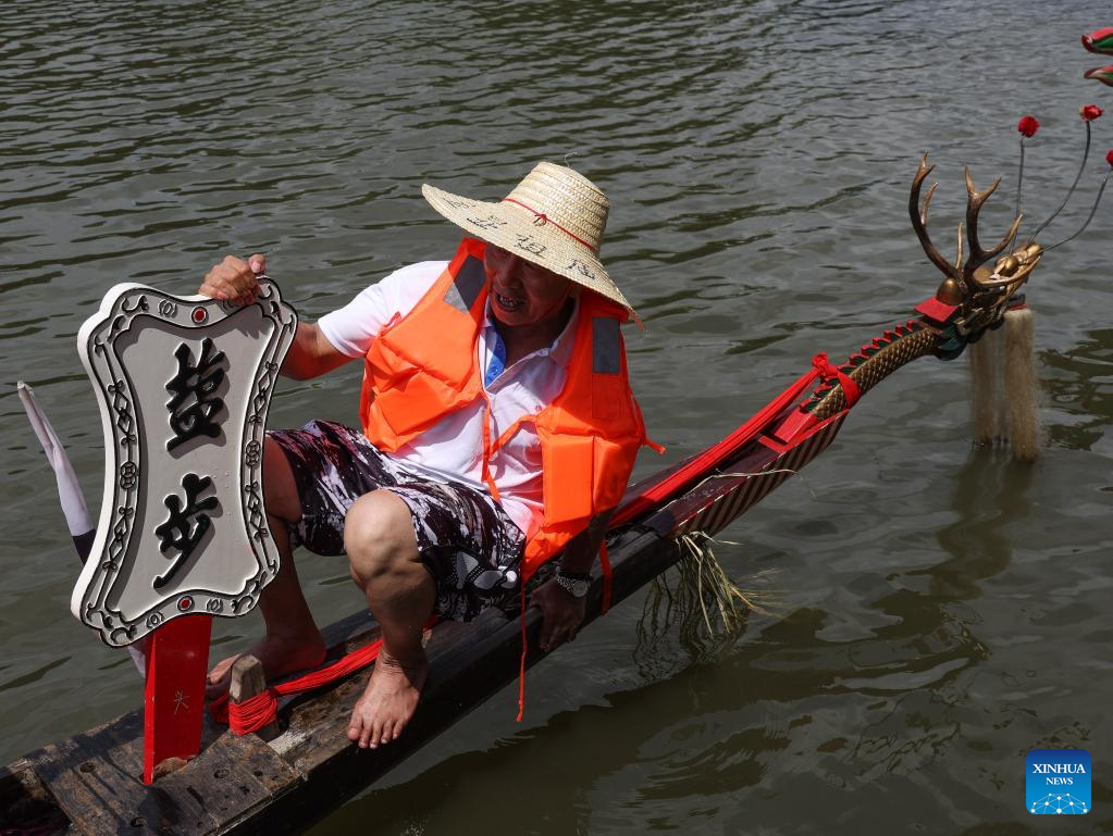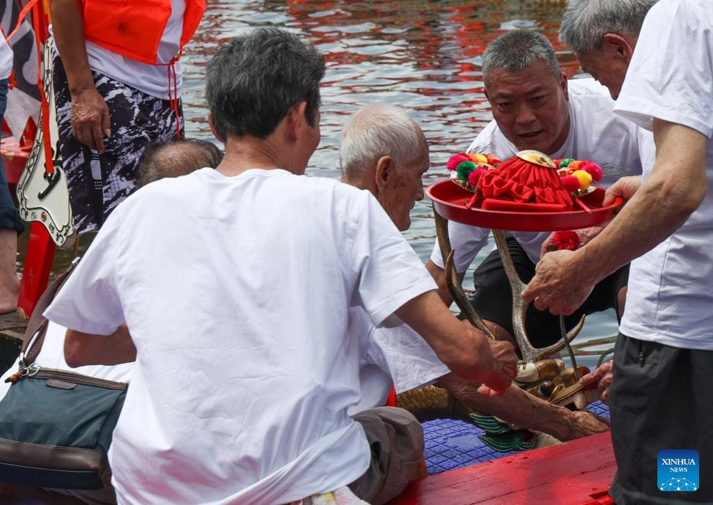 Elders from Pantang area hangs a red cloth flower for the dragon boat from Yanbu street of Foshan, in Guangzhou, south China's Guangdong Province, on June 22, 2023. For many years during the Dragon Boat Festival, people of several villages in the Lingnan area follow a tradition to row dragon boats to visit their "dragon boat's relative".