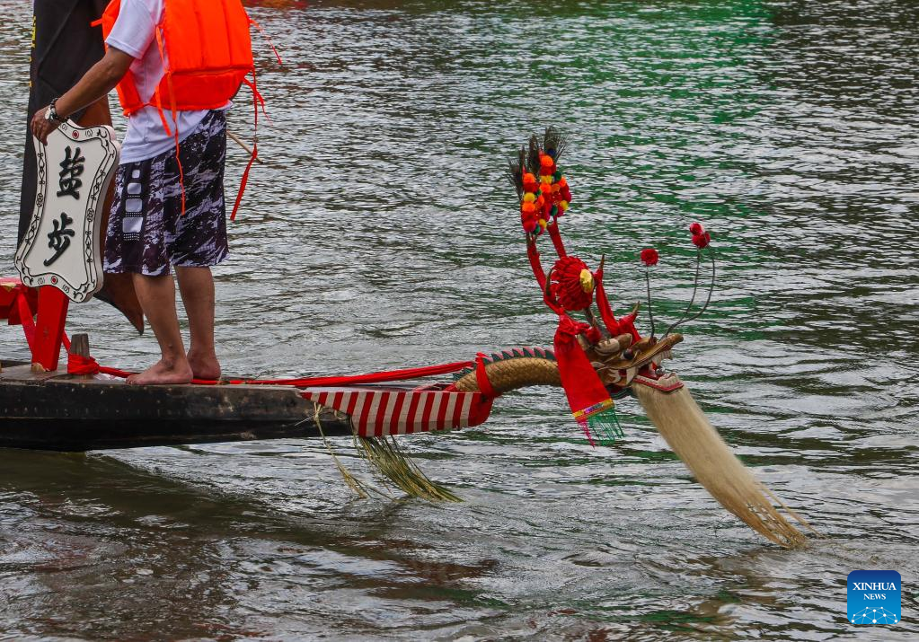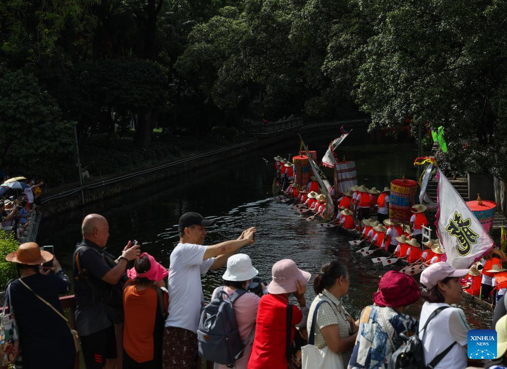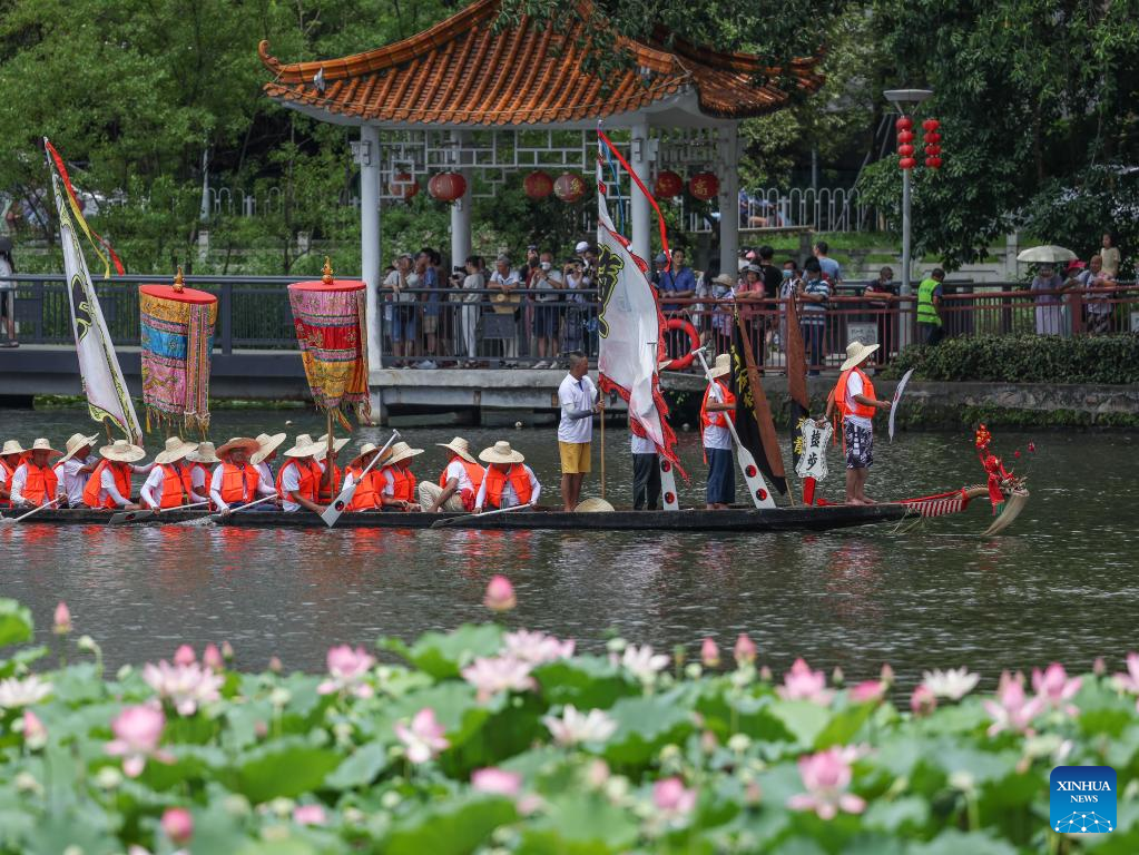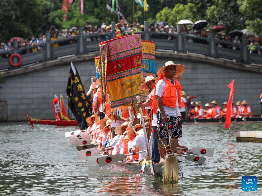 Dragon boats visit Pantangwuyue historical community in Guangzhou, south China's Guangdong Province, on June 22, 2023. For many years during the Dragon Boat Festival, people of several villages in the Lingnan area follow a tradition to row dragon boats to visit their "dragon boat's relative".