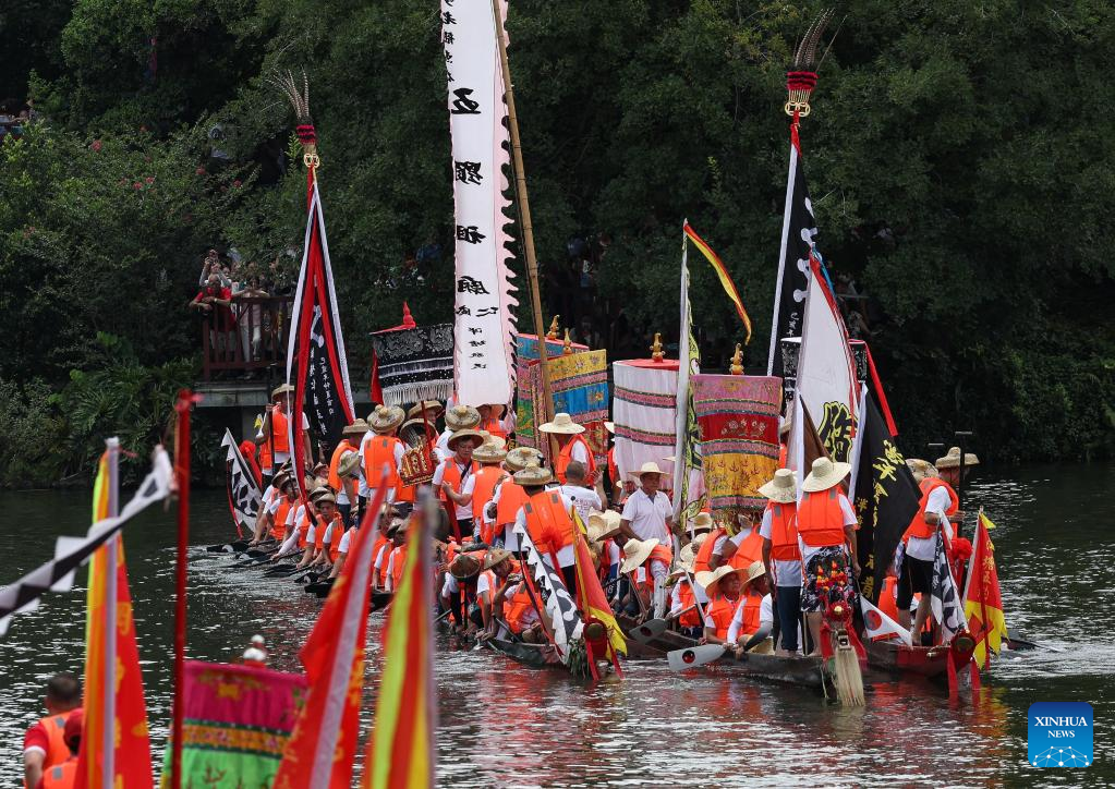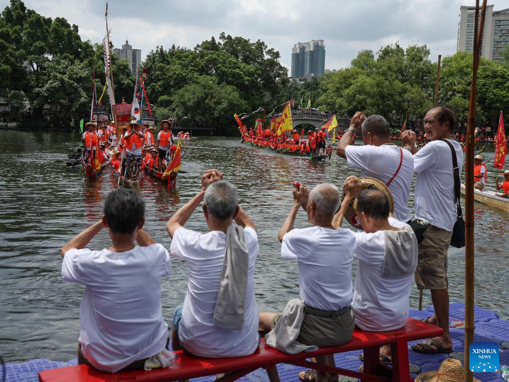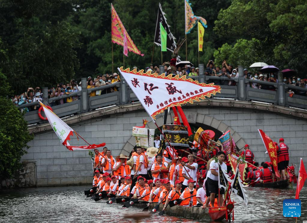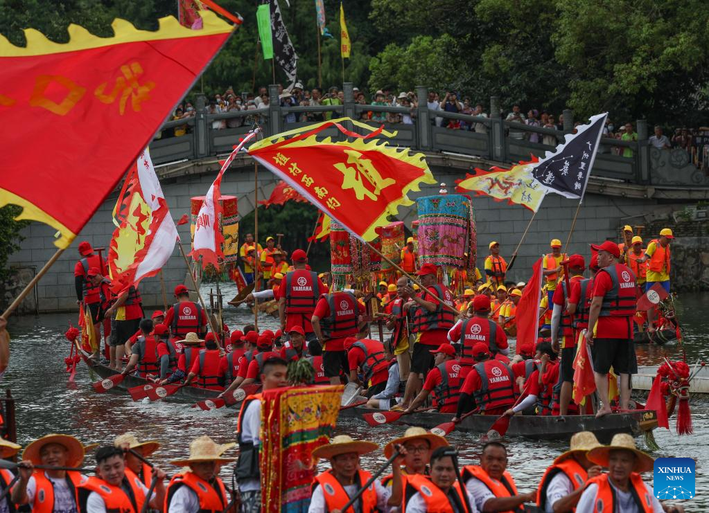 The dragon boat from Yanbu street of Foshan (C) sails on the river accompanied by dragon boats from Pantang area, in Guangzhou, south China's Guangdong Province, on June 22, 2023. For many years during the Dragon Boat Festival, people of several villages in the Lingnan area follow a tradition to row dragon boats to visit their "dragon boat's relative".