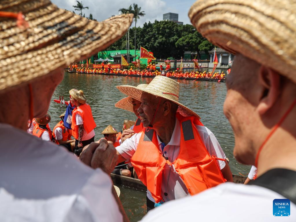 Elders from Pantang aera welcome the dragon boat from Yanbu street of Foshan (2nd L), in Guangzhou, south China's Guangdong Province, on June 22, 2023. For many years during the Dragon Boat Festival, people of several villages in the Lingnan area follow a tradition to row dragon boats to visit their "dragon boat's relative".
