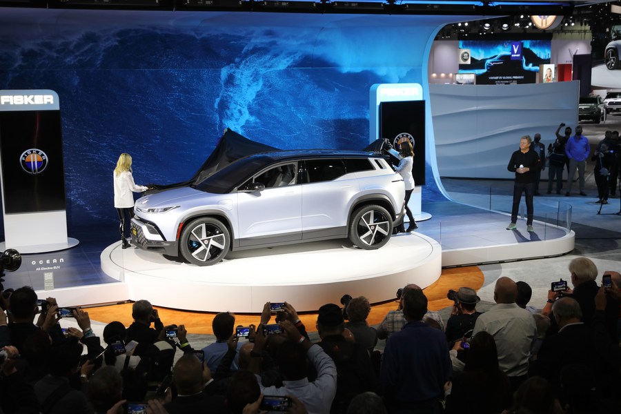 Fisker Ocean, an all-electric car, is seen at a press conference during the first-day media preview of the Los Angeles Auto Show, Los Angeles County, California, the United States, on Nov. 17, 2021. (Xinhua)