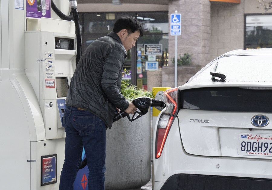 A customer refuels his car at a gas station in Millbrae, California, the United States, March 14, 2023. (Photo by Li Jianguo/Xinhua)