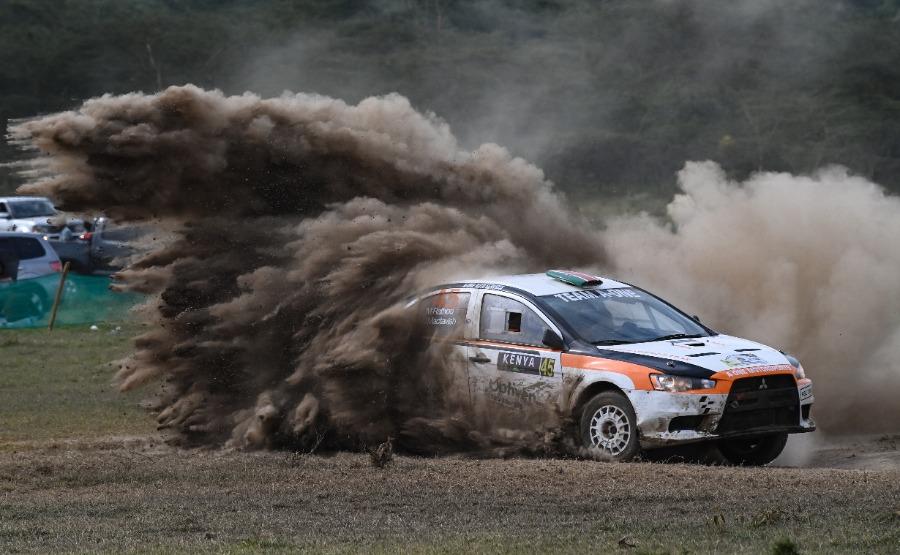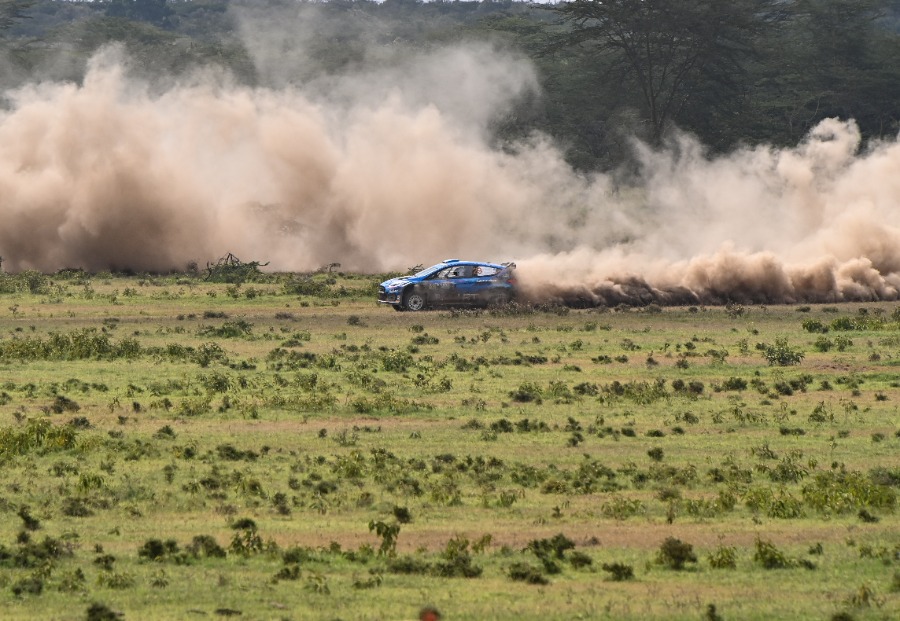 Driver Minesh Rathod and co-driver Jamie Mactavish compete on the stage of Lake Elmenteita during the 2023 World Rally Championship (WRC) Safari Rally in Naivasha, Nakuru County, Kenya, June 24, 2023. (Xinhua/Han Xu)