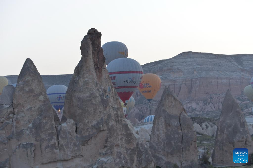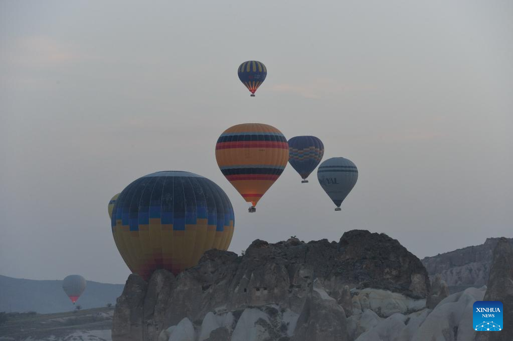 A hot air balloon flies over Cappadocia, Türkiye, on June 25, 2023. Cappadocia is a popular tourist attraction in central Türkiye known for its Goreme National Park, which was added to the UNESCO World Heritage List in 1985. (Mustafa Kaya/Handout via Xinhua)