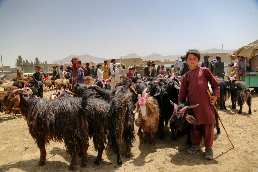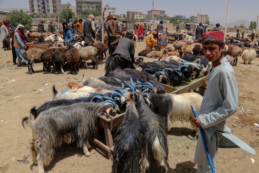 KABUL, June 26 (Xinhua) -- A bunch of local farmers brought their sheep and cattle to a livestock market for sale ahead of Eid al-Adha, one of the most important holidays for Muslims, in the Afghanistani capital of Kabul.