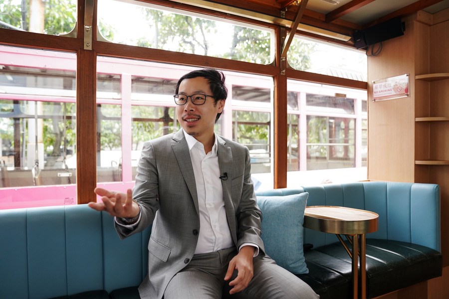 This photo taken on May 3, 2023 shows Nixon Cheung, head of Commercial and Brand at Hong Kong Tramways, in an interview with Xinhua. (Xinhua/Wang Shen)