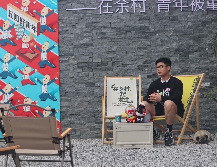 Chen Zhe shares his entrepreneurial experience in rural areas during a talent exchange event in Huzhou, east China's Zhejiang Province, May 20, 2023. (Xinhua)